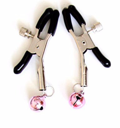 Клипсы на соски из серебристого металла. Зажимы покрыты резиновыми прокладочками, чтобы не повредить нежную кожу сосков. На концах бубенчики.