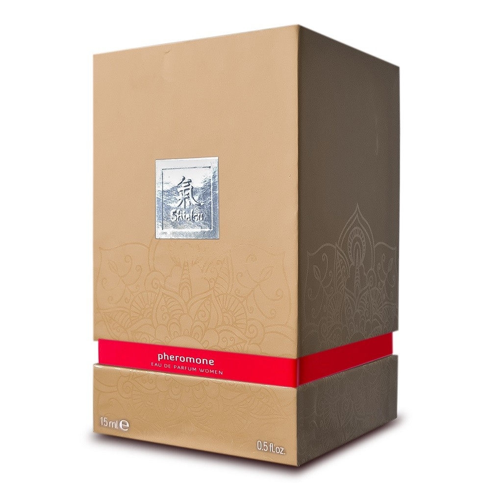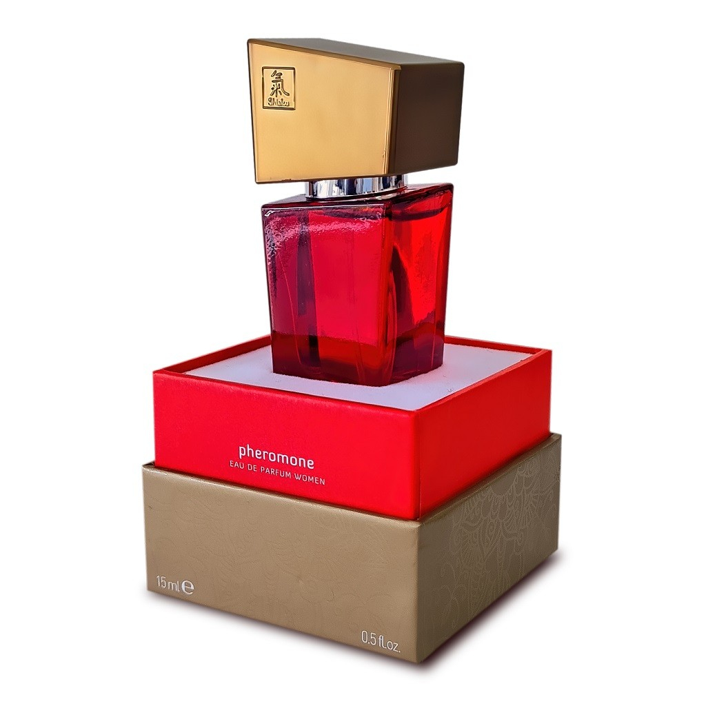 Женские духи с феромонами Shiatsu Red продаются в дизайнерской подарочной упаковке, стеклянный флакон красного цвета имеет оригинальную скошенную форму, крышка флакона цвета шоколадного золота снабжена магнитом для максимальной герметичности.